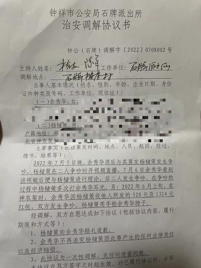 澎湃新闻从知情人士处获得的《钟祥市公安局石牌派出所治安调解协议书》显示,2022年7月5日晚,余秀华酒后与其男友杨槠策发生争吵,杨槠策在二人争吵时开视频直播,7月6日余秀华看到该视频后便与杨槠策进行理论,后二人发生争吵,在争吵的过程中杨槠策多次打余秀华耳光。另:2022年6月上旬,在神农架时,余秀华因杨槠策收他人所发的520元及1314元红包,双方发生争吵,杨槠策用手掐余秀华脖子。