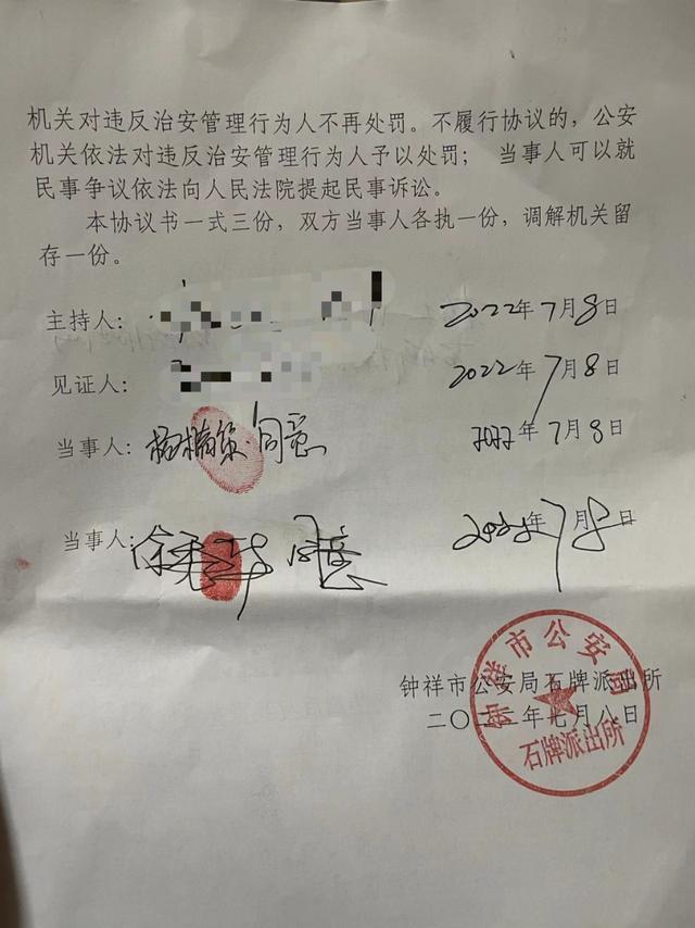 该协议盖有石牌派出所公章,并有当事双方签字,落款日期为2022年7月8日。