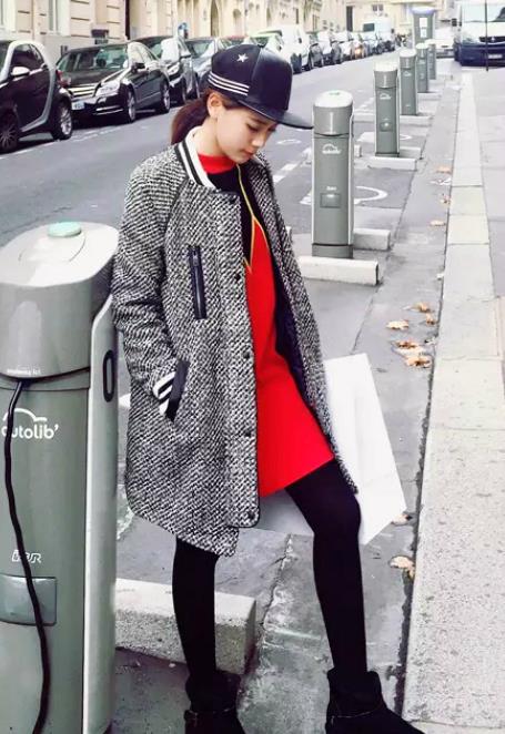 美女穿着一件大红色的上衣,搭配一条印有猫头鹰图案的短裙,时尚又有艺术感。