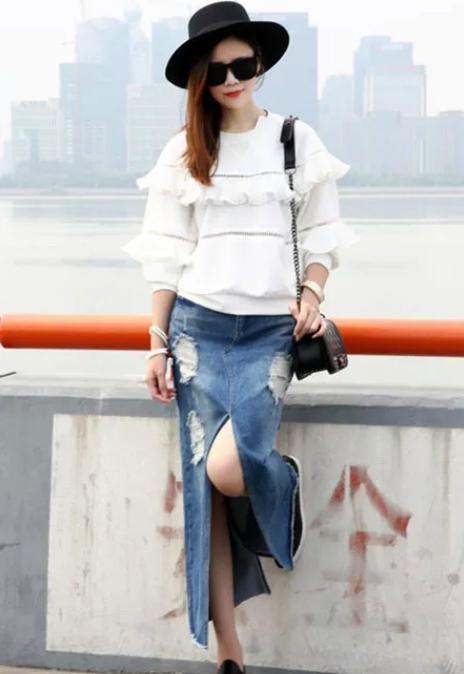美女小姐姐穿着一件白色的上衣,搭配一条前开叉的牛仔长裙,性感又优雅。
