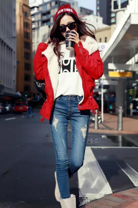 美女穿着一件红色的外套,搭配一条紧身牛仔裤,一边走路一边喝着饮料,很有范儿的样子。