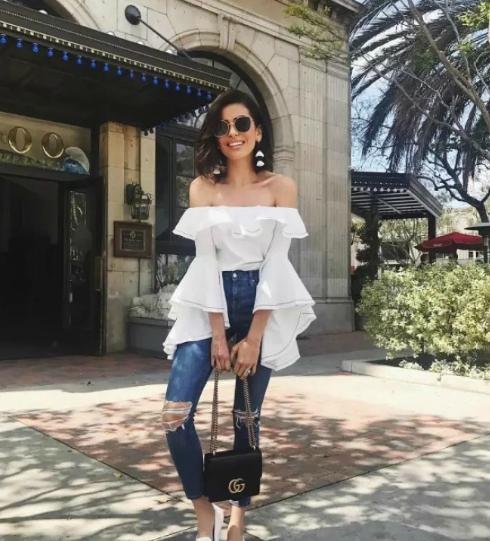 美女穿白色低胸上衣,弯腰的姿势很撩人,下身搭配一条破洞牛仔裤,很有时尚感。