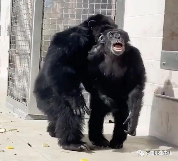 当Vanilla暂住的笼子缓缓打开,等候在此迎接新朋友的阿尔法雄性黑猩猩Dwight,立刻给了Vanilla一个大大的拥抱。