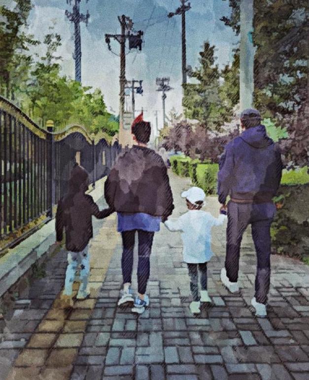 照片中是一家四口的背影,隔着屏幕都能感觉到幸福。