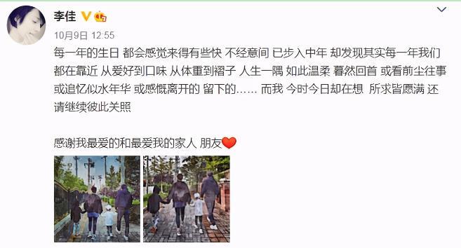 靳东的妻子李佳在网上发布了一张全家福,借此庆祝自己的生日。