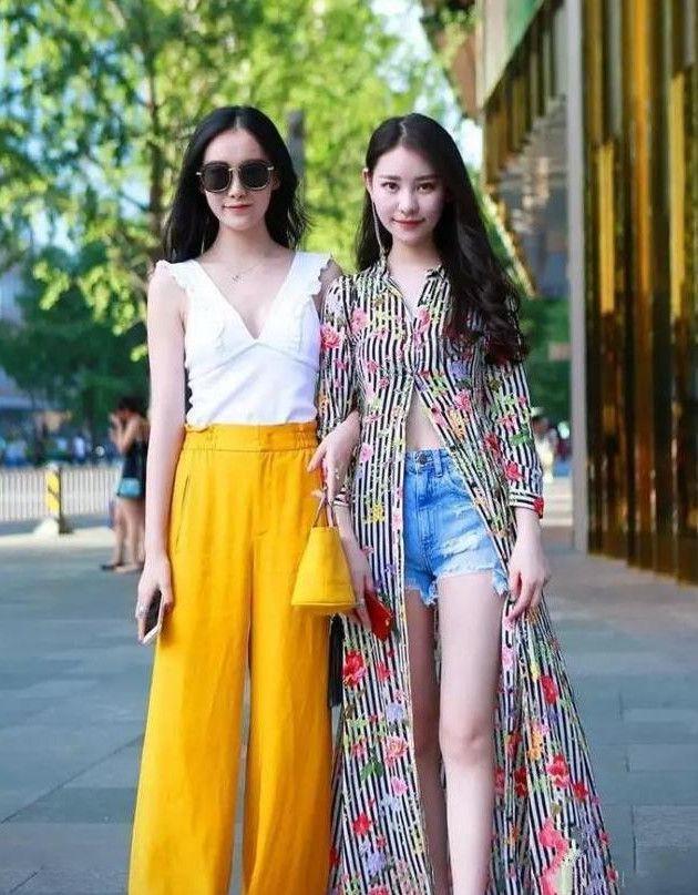 街拍:身姿卓越的小姐姐,搭配低胸T恤+黄色喇叭裤,身材高挑,展现女神气质