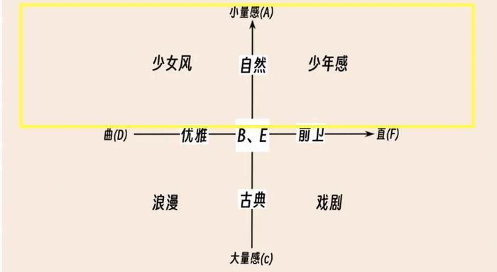 参考下面这张风格坐标系,清淡的五官量感小总体更偏向自然含蓄的风格,参考的是坐标系的上半部分,根据面部骨骼的曲直度可进一步判断风格是更少女还是少年感。