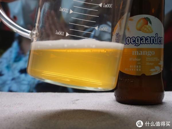 入口的白啤风味占据主导,由于芒果的加入,口感变得有些绵密,前段是白啤的风味,后段是芒果的香甜感,像是啤酒中加了一块芒果的感觉。