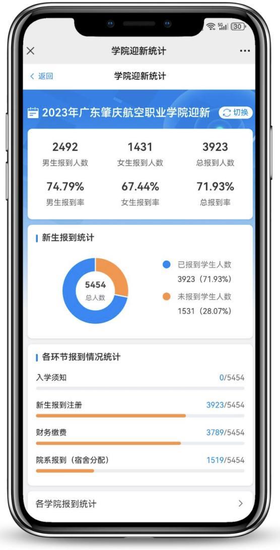 在广东肇庆航空职业学院的迎新中,学校领导、老师只需要通过移动端即可随时随地查询学院报到情况,打破时空和地点局限,实时跟踪报到数据,掌握迎新动态。