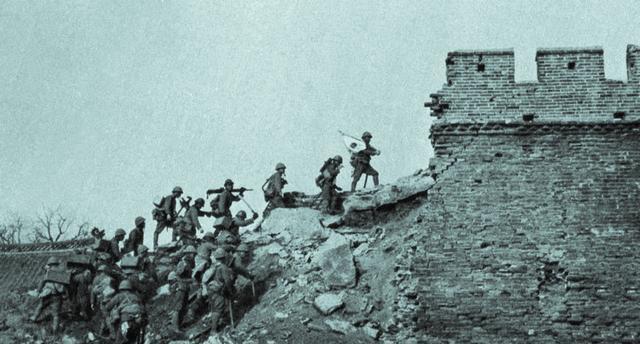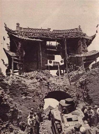 (1938年3月17日,日寇登上几乎被炮弹轰平的滕县城楼)