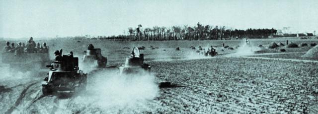 (1938年3月17日,由山东滕县向临城南进的日军福荣、赤柴战车队。)