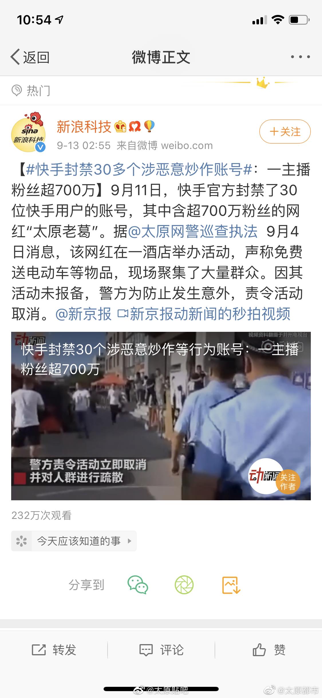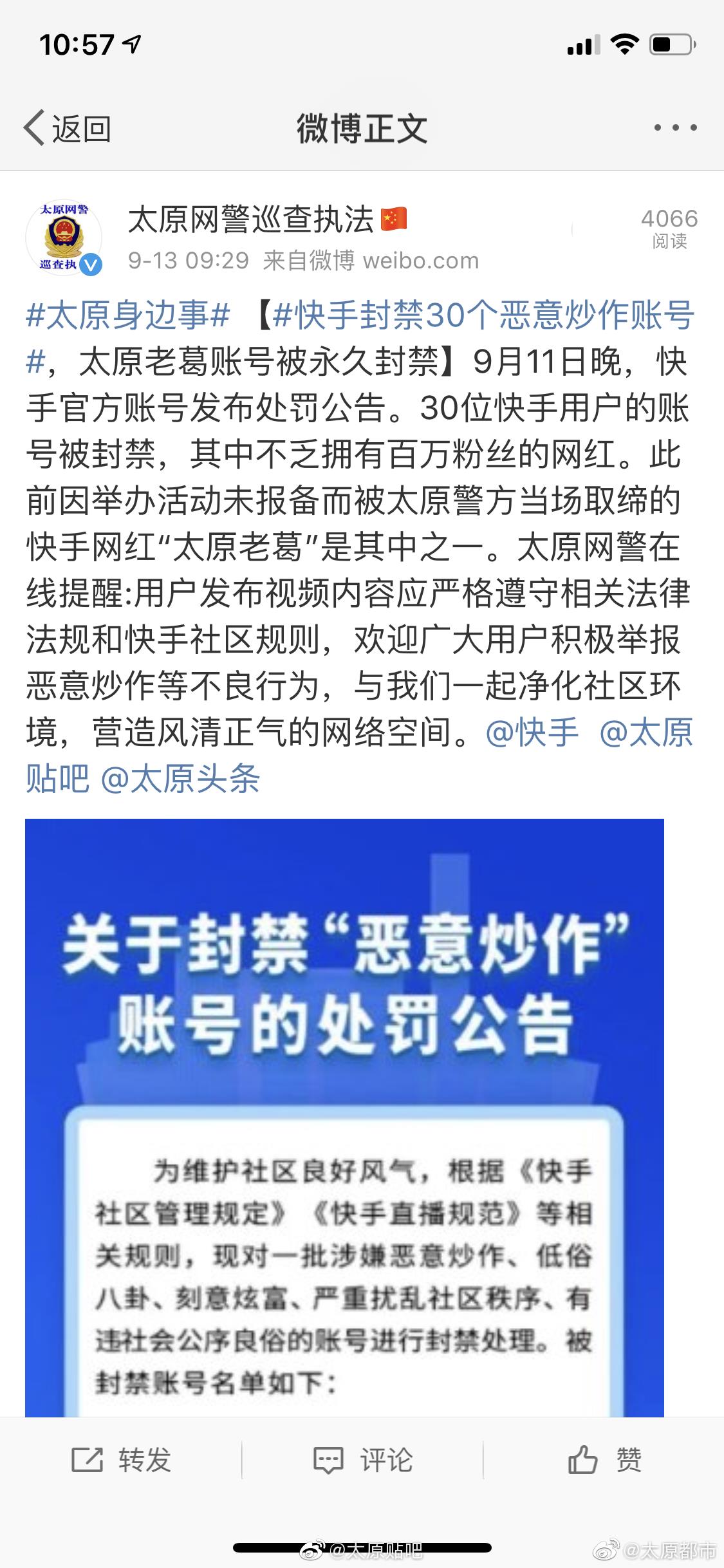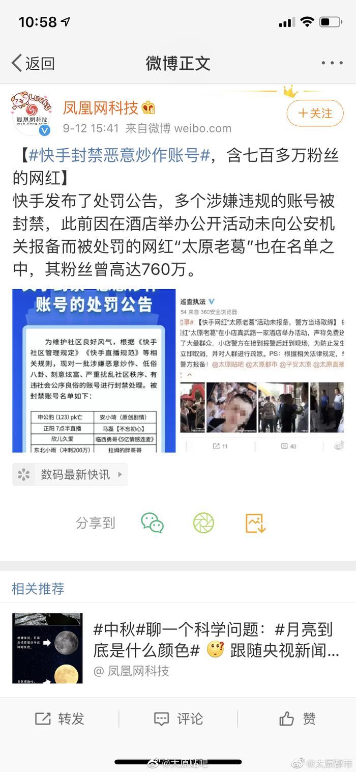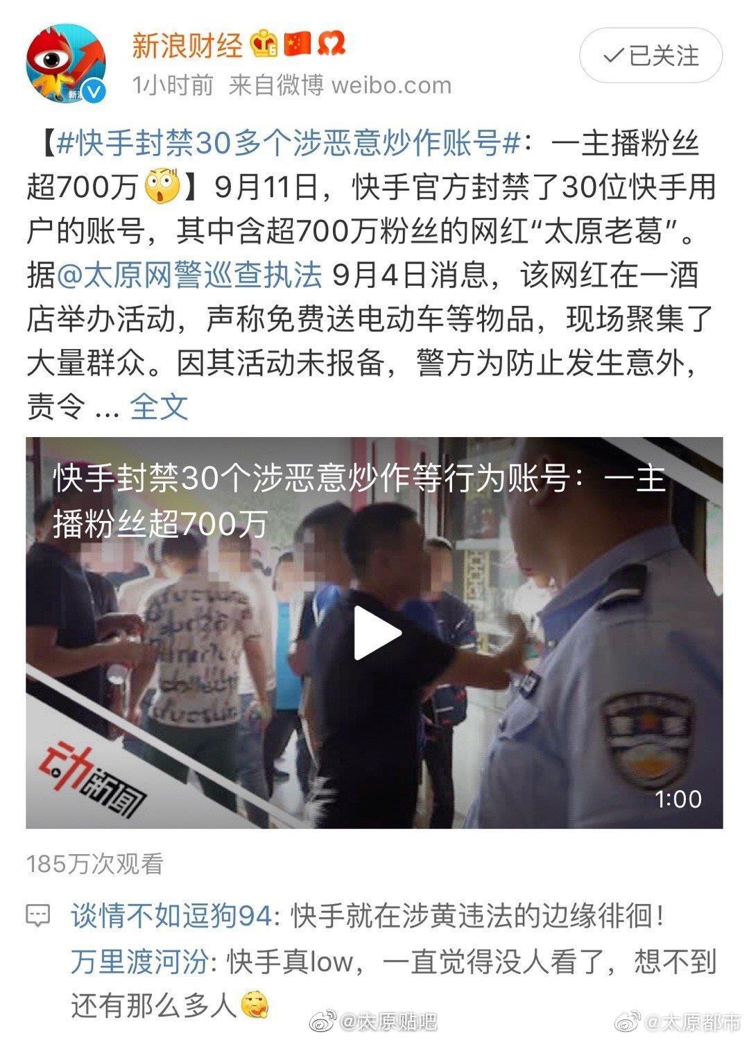 9月11日下午,快手发布官方公告,封禁30个账号,此事于今日登上微博热搜,包括@新浪科技 @新浪财经 以及@澎湃新闻 @凤凰网科技 等多家媒体均报道了此事并重点提及太原老葛,尤其值得注意的是@太原网警巡查执法 先后两次点名“太原老葛”,@山西政法 也发文点名,看来这哥们是彻底凉了。
