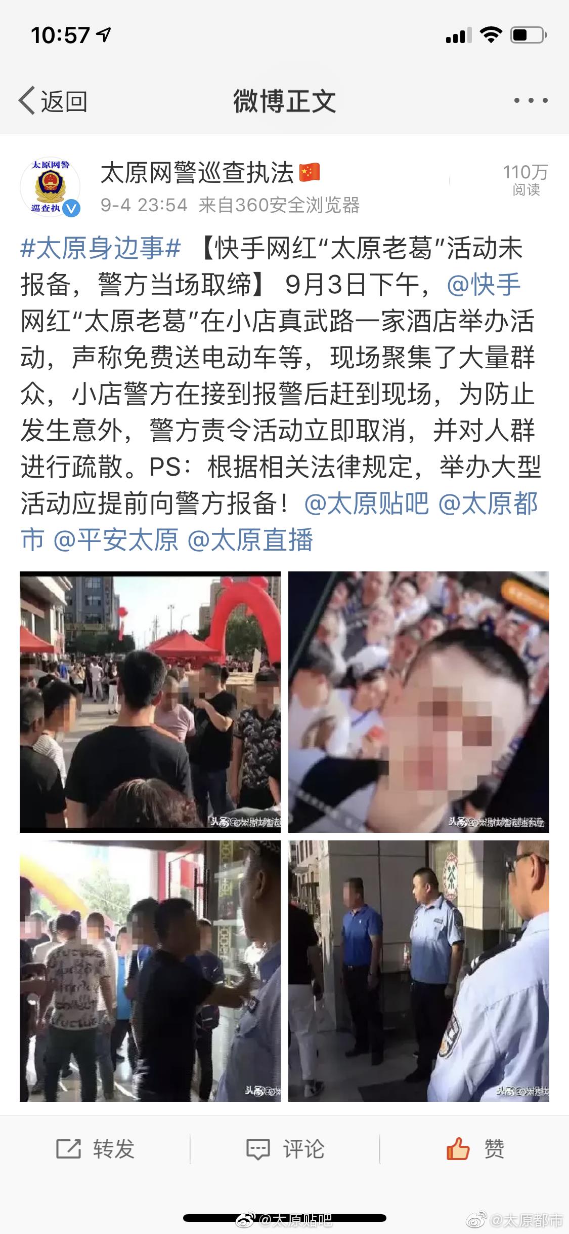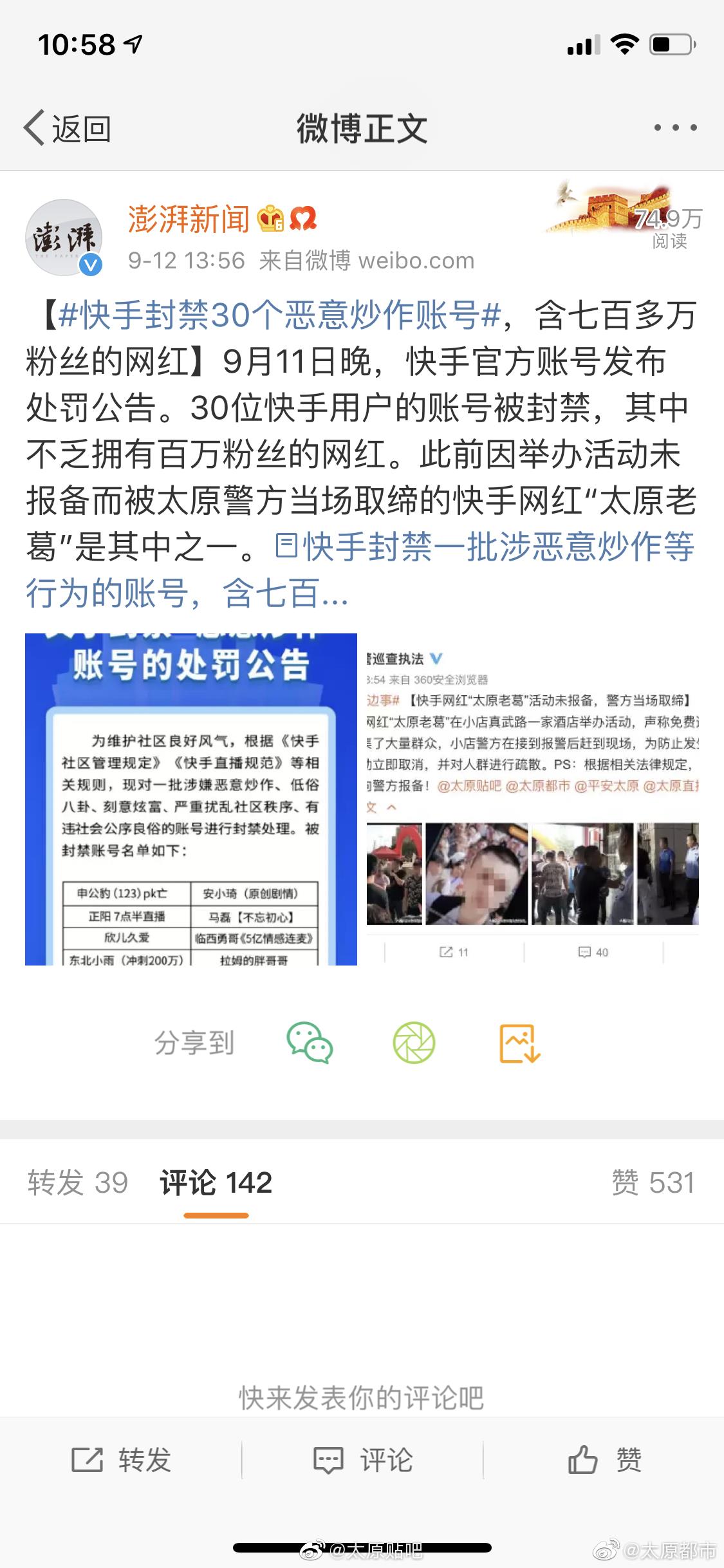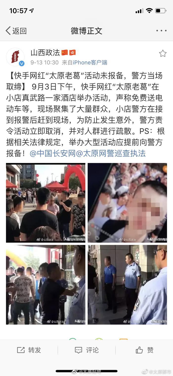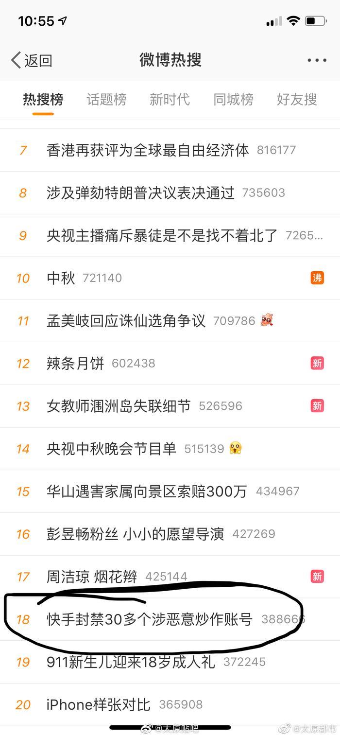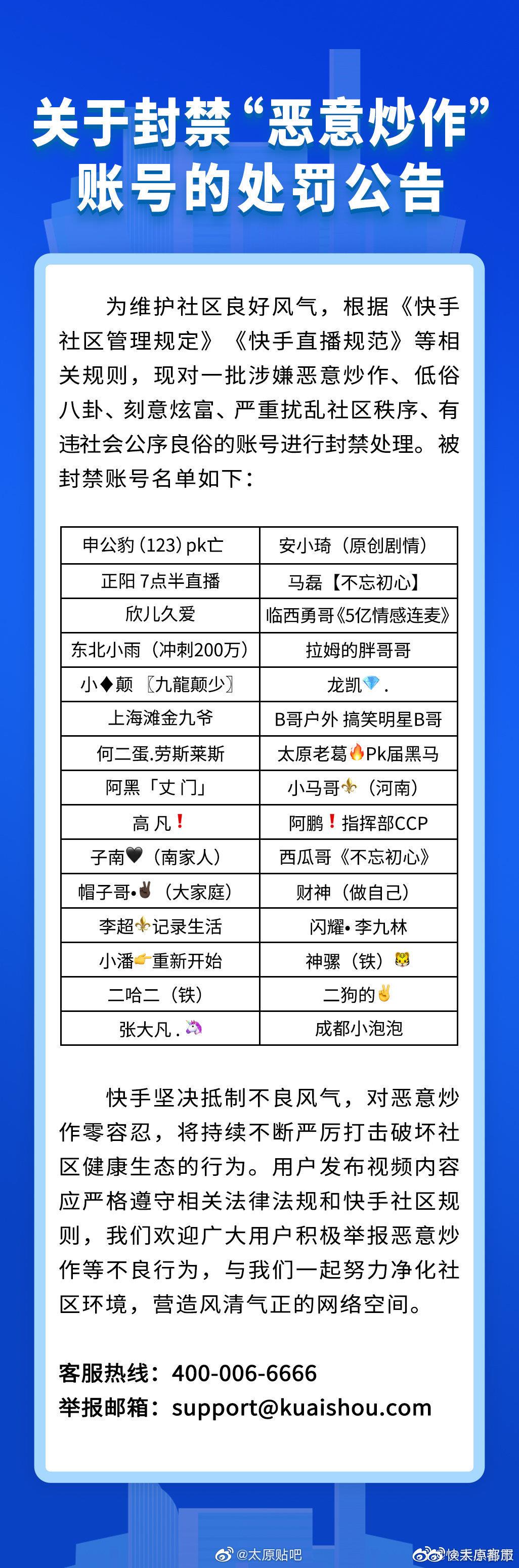 9月11日下午,快手发布官方公告,封禁30个账号,此事于今日登上微博热搜,包括@新浪科技 @新浪财经 以及@澎湃新闻 @凤凰网科技 等多家媒体均报道了此事并重点提及太原老葛,尤其值得注意的是@太原网警巡查执法 先后两次点名“太原老葛”,@山西政法 也发文点名,看来这哥们是彻底凉了。