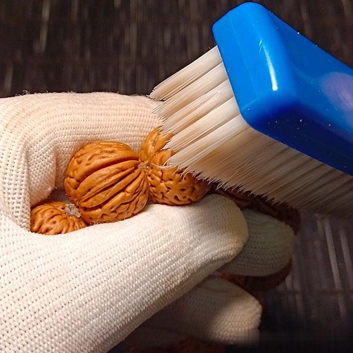 钢丝刷刷过之后,我们该用纳米刷进行再次的清理和抛光,纳米刷的干刷是打底最终形成的主要因素,所以纳米刷一定刷的仔细,刷的均匀,使用纳米刷打底的时间可以控制在7-15天,总体来说刷到油光铮亮就可以了,纳米刷打底的同时,会将桃核的文理深处刷的很干净,同时对表面形成一个较好的抛光作用,所以纳米刷是打底不可缺少的一个环节。