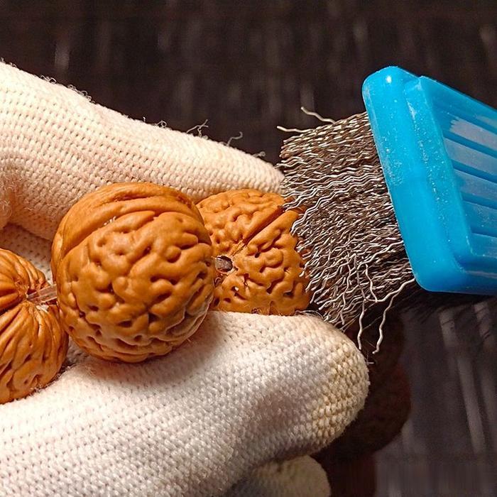 桃核手串的保养个人一直认为不要上油,使用较好的猪鬃刷或者马鬃毛刷来进行日常的保养,除了接触手掌、身体的油脂汗液以外,剩下的就是多刷,尽可能的不上油,干刷为主。有朋友会说,不上油裂了怎么办?
