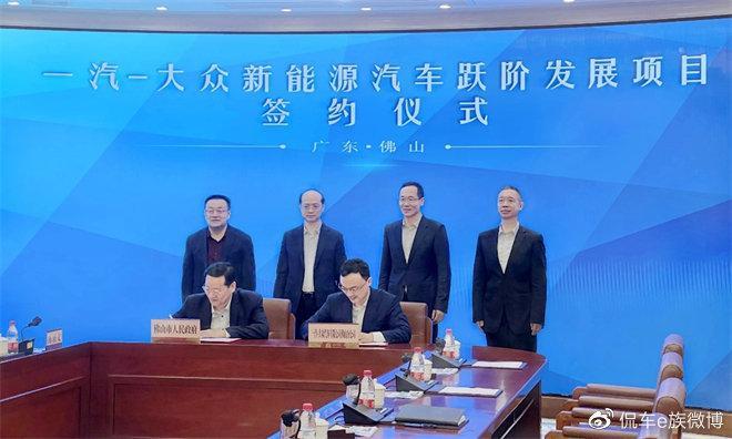 签约仪式上,佛山市委书记郑轲表示,一汽-大众十多年来不断加大在佛山的投资布局力度,为佛山经济社会发展做出了积极贡献。希望一汽-大众依托雄厚的企业实力和技术储备等优势,携手佛山抓住新能源汽车发展重要战略机遇期,不断增强企业的市场竞争力和影响力。佛山将全力打造一流营商环境,加快推进新能源汽车跃阶发展项目建设,支持企业扎根佛山做大做强。