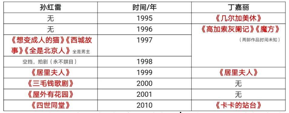 作品可以看出孙和丁嘉丽在话剧资源方面自1997年之后孙明显是高于丁的,所以不存在丁嘉丽为孙祈求他人拿到资源的情况。