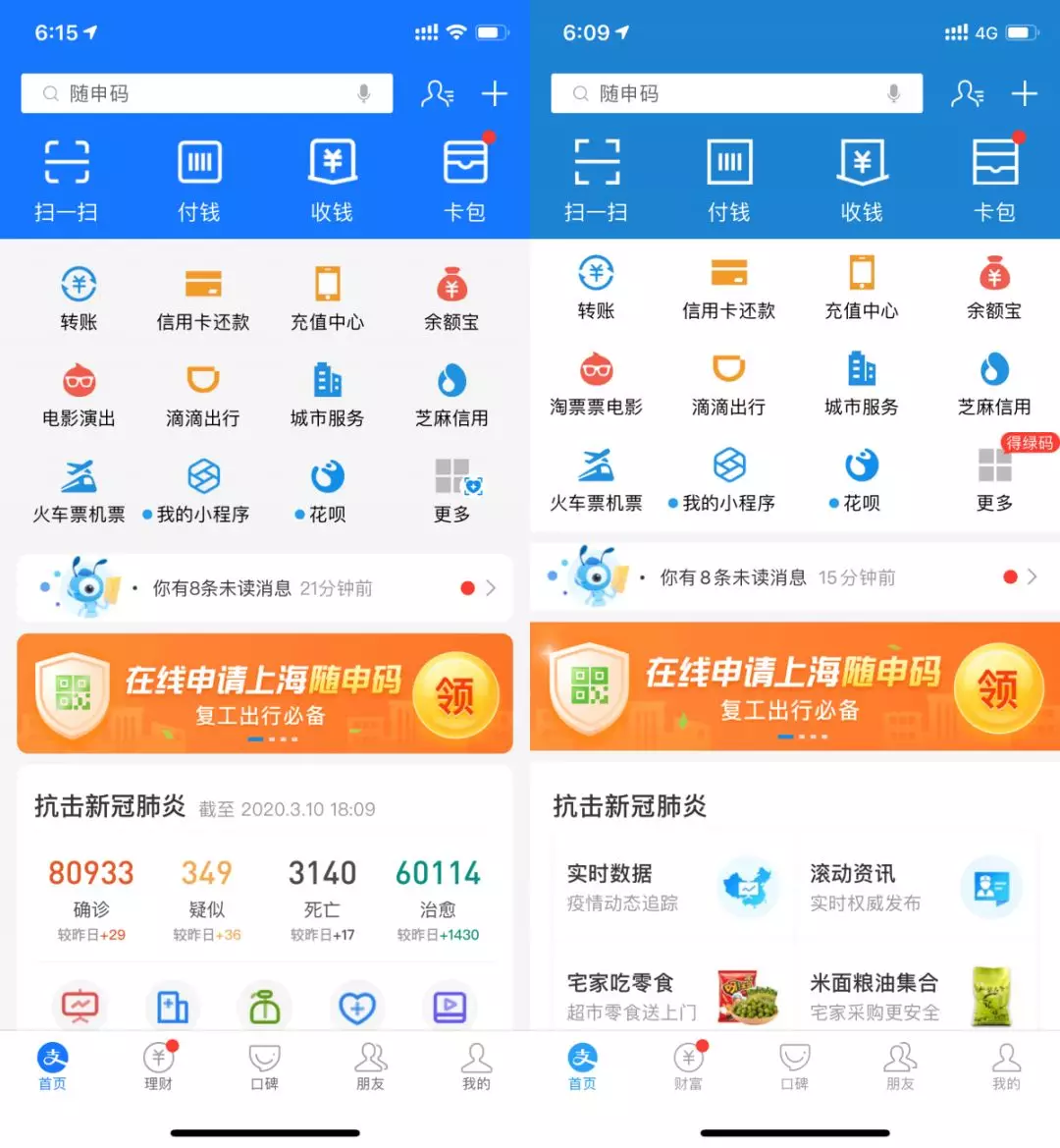 支付宝除了logo调整之外,APP客户端的界面也统一更换为了新版logo的蓝色,首页应用中心的布局从之前9个变成了14个,增加了多个生活服务板块,包括外卖、美食玩乐、酒店住宿、市民中心等入口,也是在为这些板块增加曝光度。