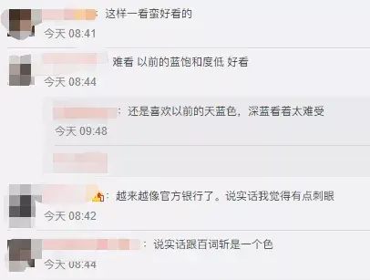 不过,对于新版的「支付宝蓝」,大家好像都不怎么特别的接受这一变化,认为原来的低饱和度蓝,看上去更好看,新的蓝色饱和度过高,有点像官方银行,明亮到有点刺眼。