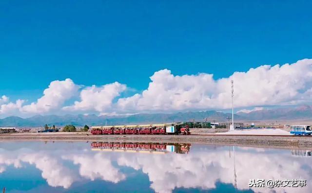 茶卡盐湖夹在祁连山支脉完颜通布山和昆仑山支脉旺尕秀山之间,两山常年积雪,雪山倒影在湖面,形成水天相交、盐湖与雪峰交相辉映的青藏高原独特自然风光。茶卡盐湖旁,还有着一排铁轨,以前是采盐火车专用,现在则是观光小火车,游客可以选择搭乘小火车到茶卡盐湖深处观光。