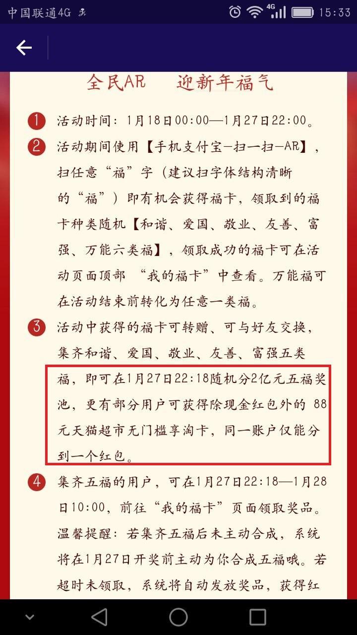 而其实在活动的出现,活动规则就很完整,但是却没有在一个很明显的地方,因此很多人可能会发现不了。在集福活动的右上角有一个活动规则,里面很详细的说明了,今年的活动计划,最重要的一点“同一账户只能得到一个红包,或者是88元天猫超市无门槛享淘卡。”看到这个是不是傻眼了?本来自己第一天都已经集齐了,结果到了现在还乐此不疲,结果这个规则不知道,还在一天天在喊着要“敬业福”(当然,小编就有这样的心里,呜呜)。