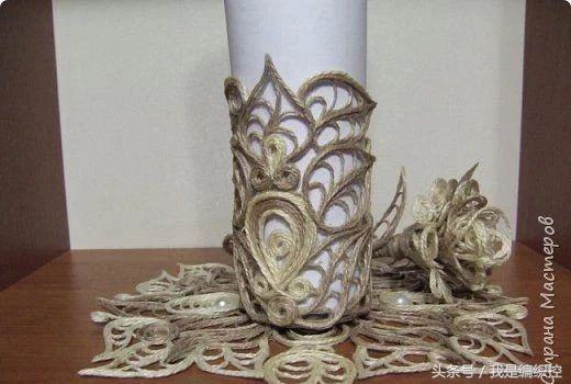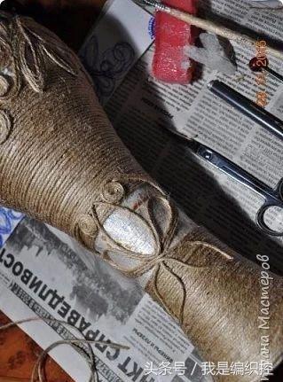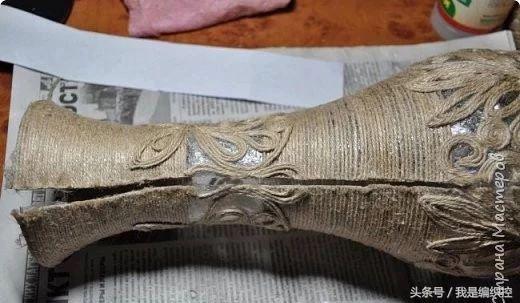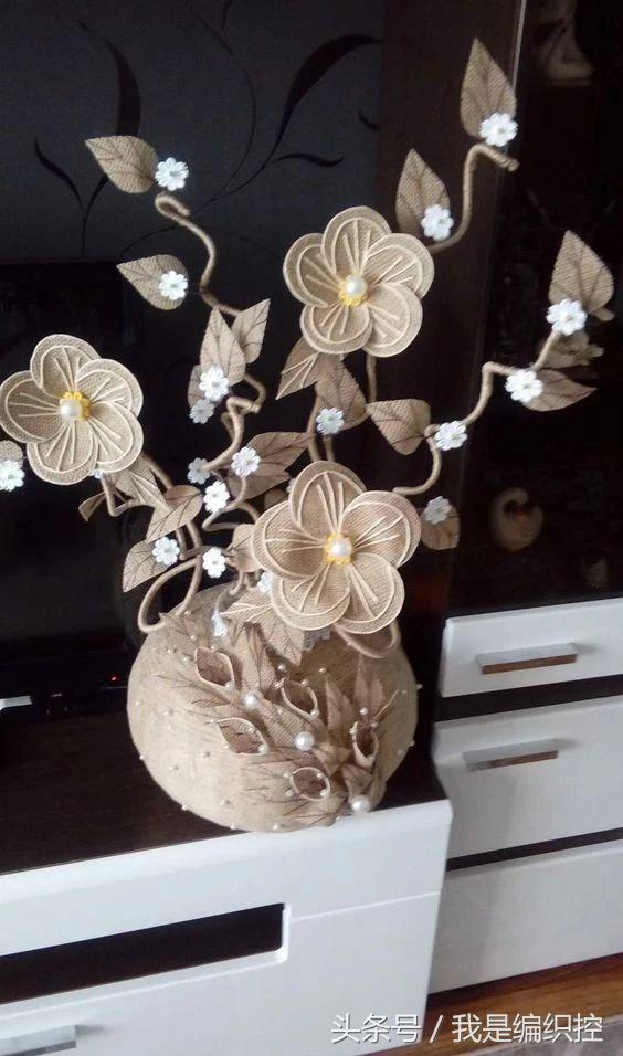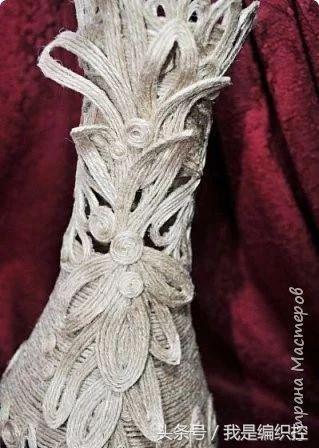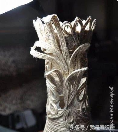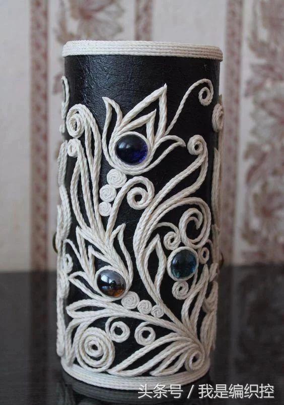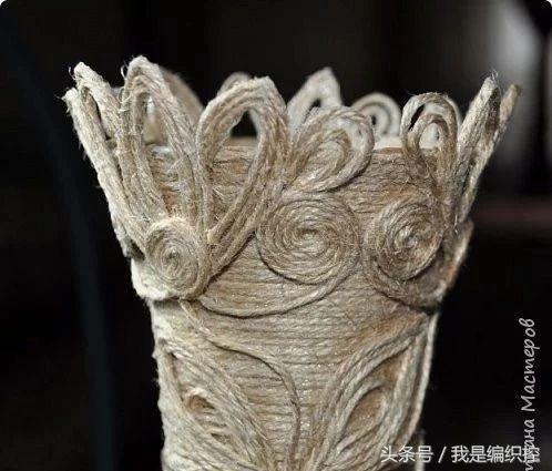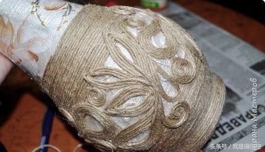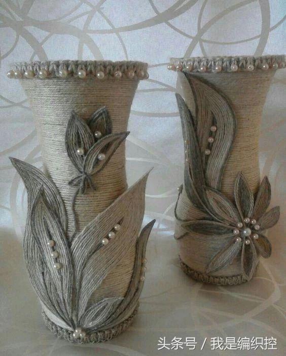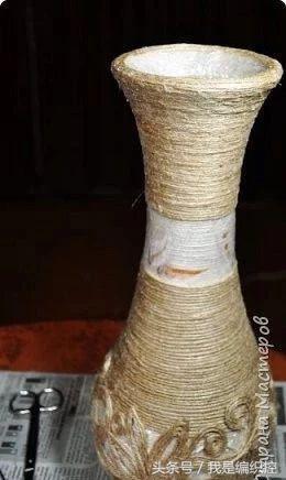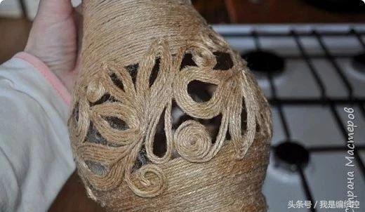 而花瓶这种做法,可先用一个花瓶做模具,在外面包上保鲜膜,绕上绳子做造型。干后用剪刀剪开两半,撕开保鲜膜,再用胶水把剪开的切口粘合,一个镂空的花瓶就做好了。
