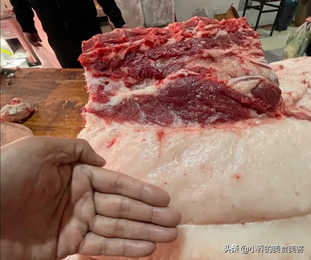因为篇幅太长所致,如何具体分辨出这块肉到底是什么肉,是哪个部位的肉,有时间我再写。但是有一点大家要记住了,那种看起来太瘦的肉,肥肉太少的肉,尽量不要买,那种都是几个月就出栏的肉,营养和味道,要差很多。真正的农民自己养的那种猪肉,你看这大肥膘子,一口下去满嘴流油,满嘴留香,这才叫猪肉,见下图。