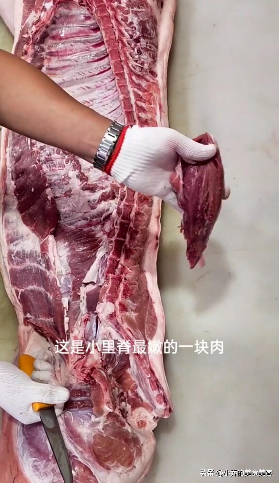 另外,这里还要着重介绍一下小里脊,大家仔细看这张图,在整条里脊肉的下面,还有一小块肉,这块肉是从里脊肉下面、靠里的位置割下来的,这块肉是猪全身最水嫩的一块纯瘦肉,是溜、炒、爆、炸的最佳部位。这块肉最多也就几两重,一般抢不到,哈哈,见下图。