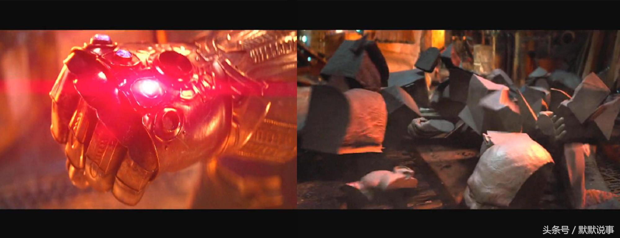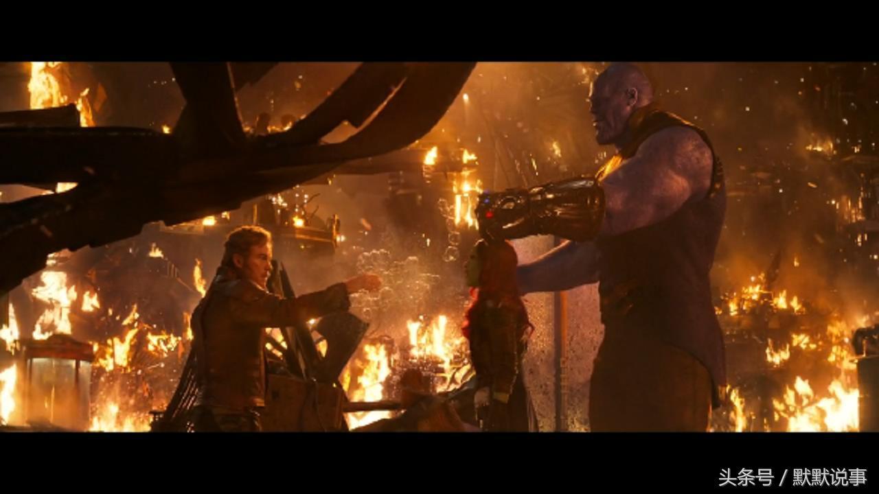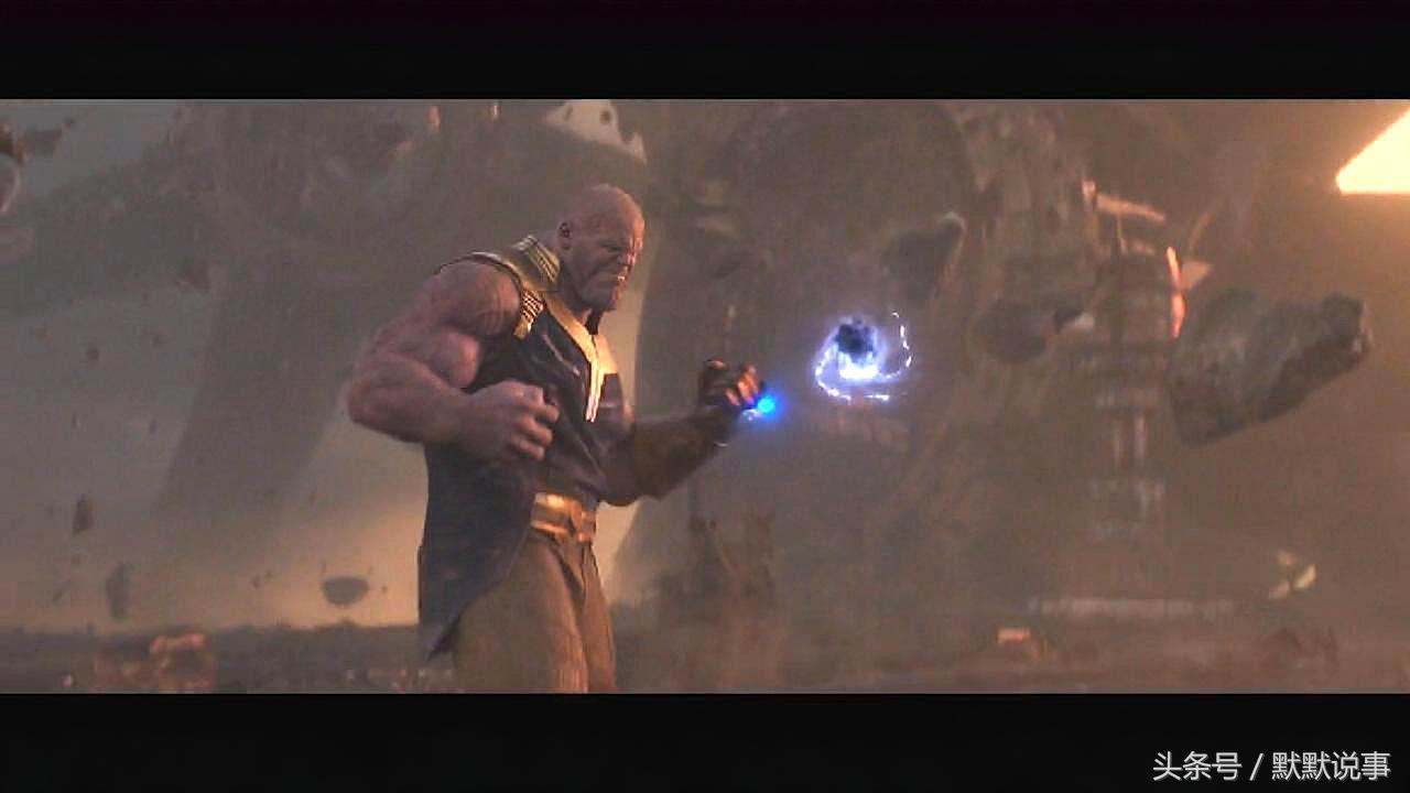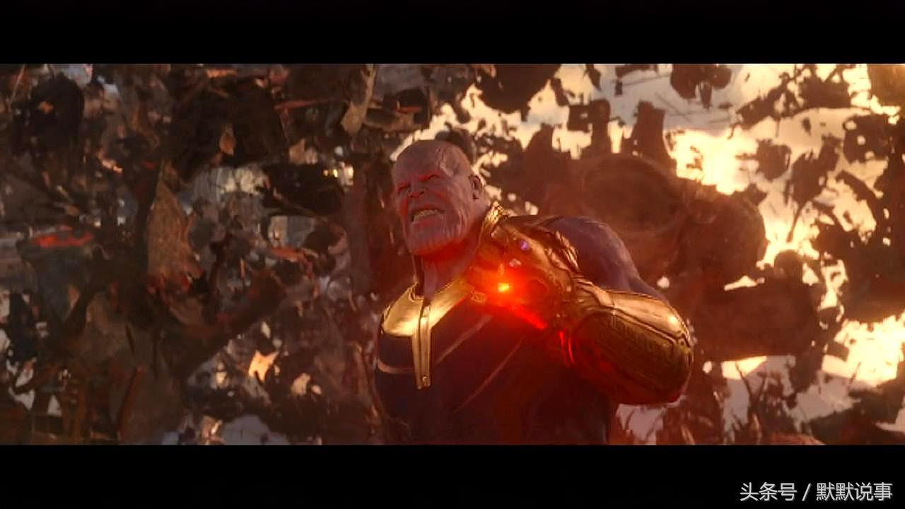7、泰坦星大战中的这个画面,灭霸的手套呈现红色,是动用了现实宝石的能力。