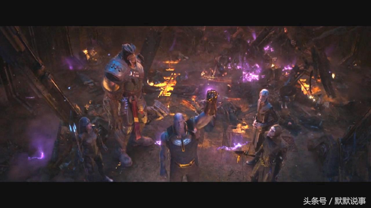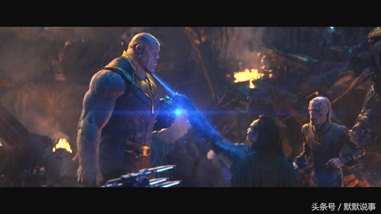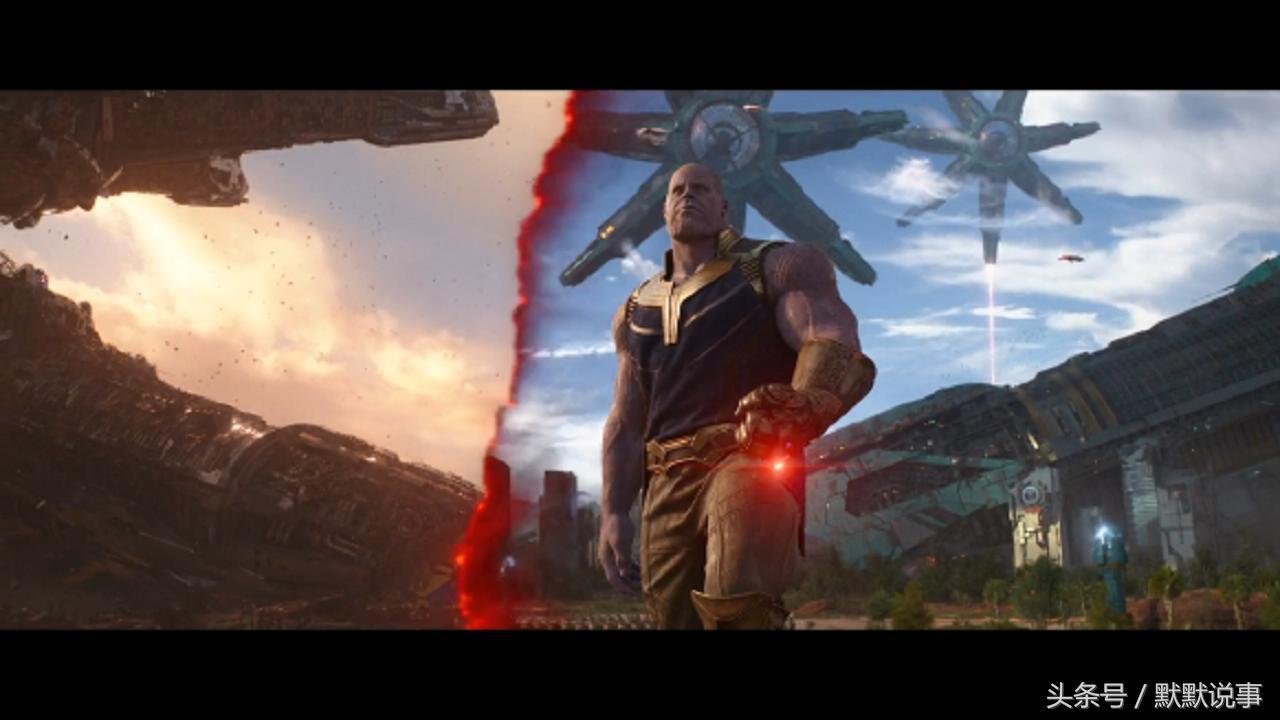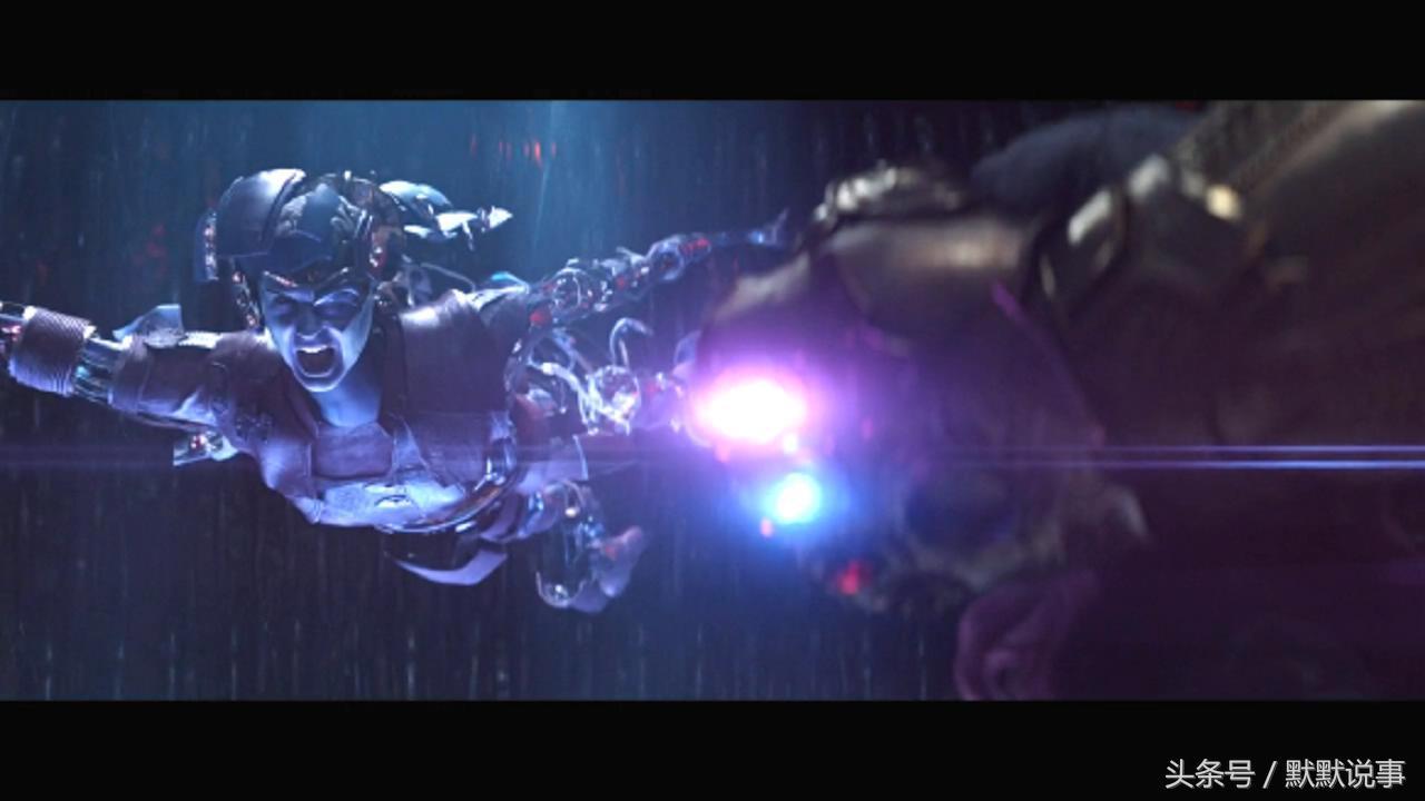 7、泰坦星大战中的这个画面,灭霸的手套呈现红色,是动用了现实宝石的能力。