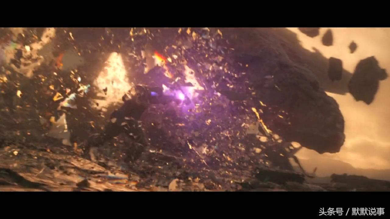 4、泰坦星上,奇异博士与灭霸谈话过后,一个巨大的物体从天而降,直接坠落到灭霸的头上,那一瞬间,我们可以看到灭霸使用了力量宝石的能量来阻挡物体。