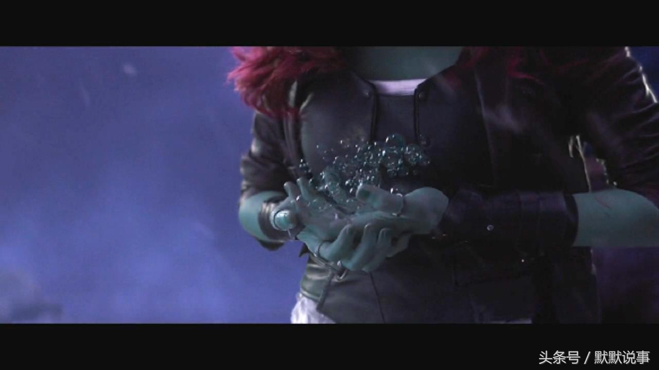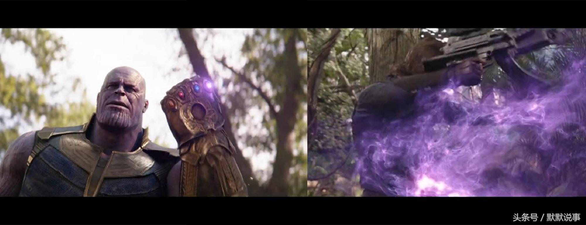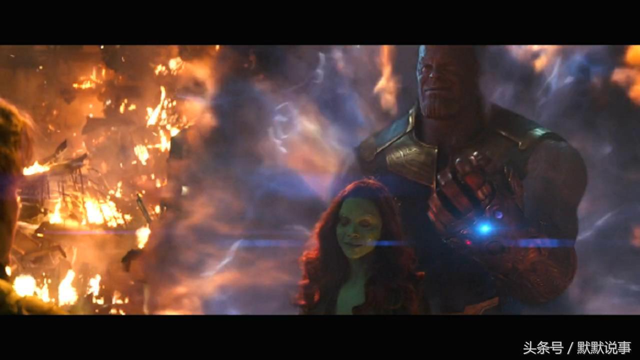 4、星爵含泪准备用元素枪对卡魔拉射击,结果被灭霸用现实宝石变成泡沫。
