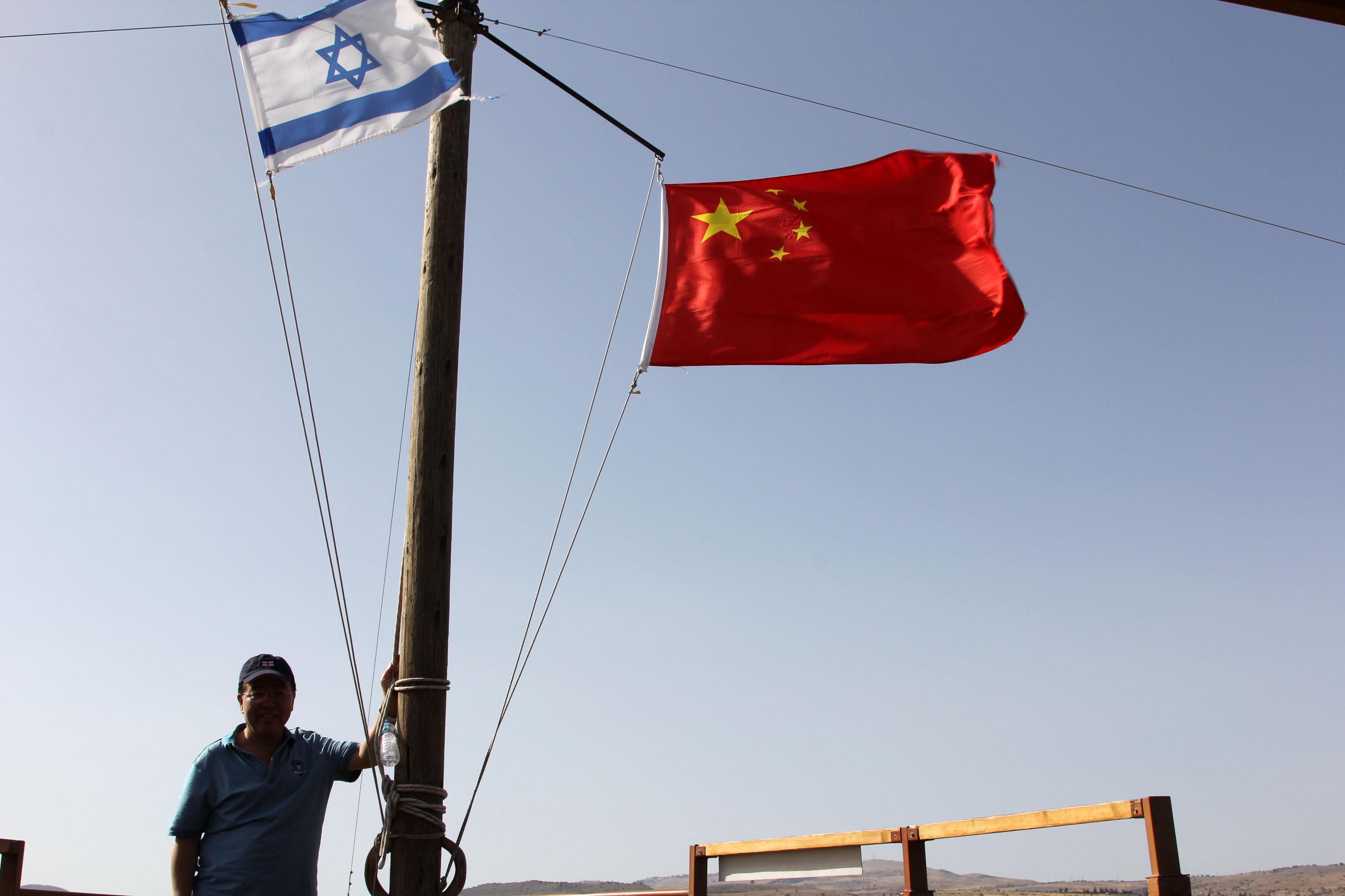 鲜艳的五星红旗在加利利湖上空冉冉升起