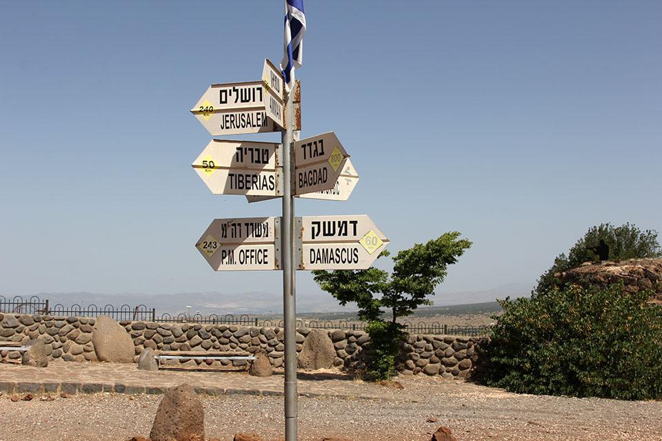本塔尔山顶的空地上,设立的路标指示牌,立着一个3米多高的方向标。标顶写着不同地名和里程的指示牌,指往不同方向。地名中,有耶路撒冷、提比里亚、特拉维夫、海法、安曼、巴格达、大马士革等。距耶路撒冷240公里,提比里亚50公里,海法85公里,巴格达800公里,大马士革60公里……