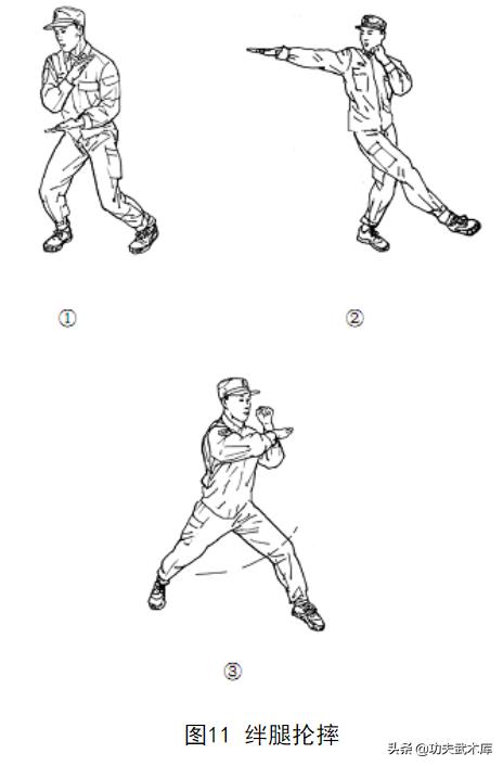 【动作要求】进步抄抱快,背步绊腿猛,转体抡摔猛。