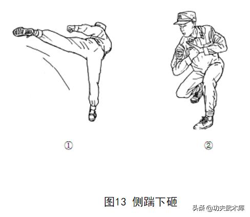 【动作要领】右脚在左脚后垫步的同时,起左脚侧踹;左脚前落步成游龙步的同时,右肘在胸前下砸与膝同高,左拳变立掌顶压右拳面,目视前下。(图13-1、图13-2)