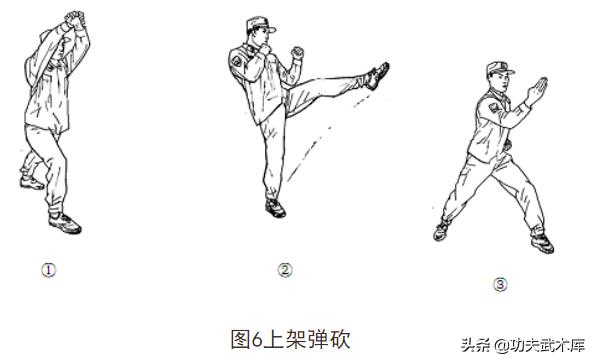 【动作要求】上架有力、弹踢迅猛、砍击准确。