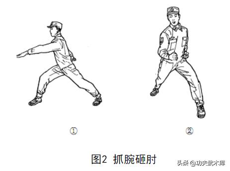 【动作要求】垫步抓腕快,转体砸肘猛。