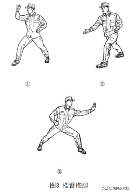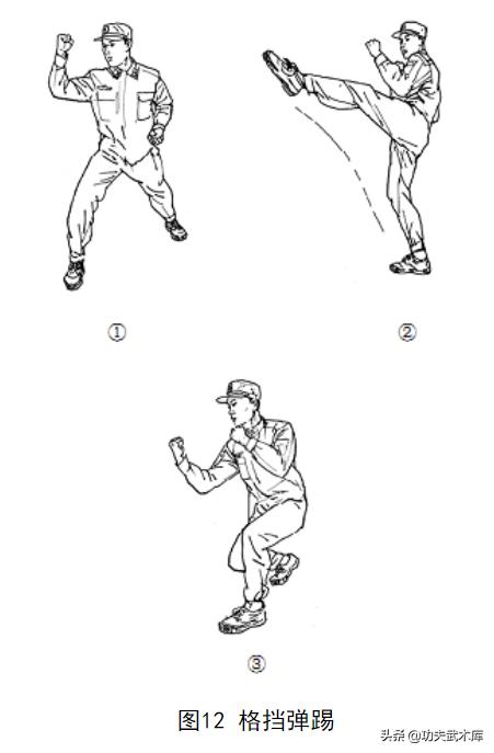 【动作用途】架防护头,弹踢敌裆,掌砍敌颈。