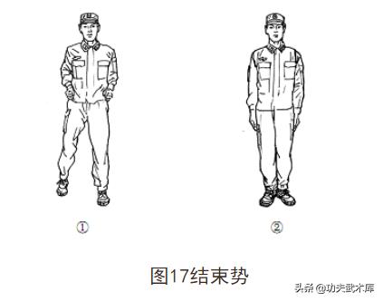 结束式:身体向右转的同时,两拳收于腰际,拳眼向上,两腿挺直;右脚靠拢左脚的同时两手放下,成立正姿势。(图17-1、图17-2)