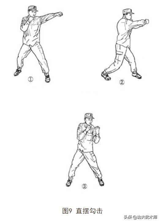 【动作要领】左脚进步的同时右直拳;右脚跟步接右摆拳;右转体接左勾拳,目视前方。(图9-1、图9-2、图9-3)