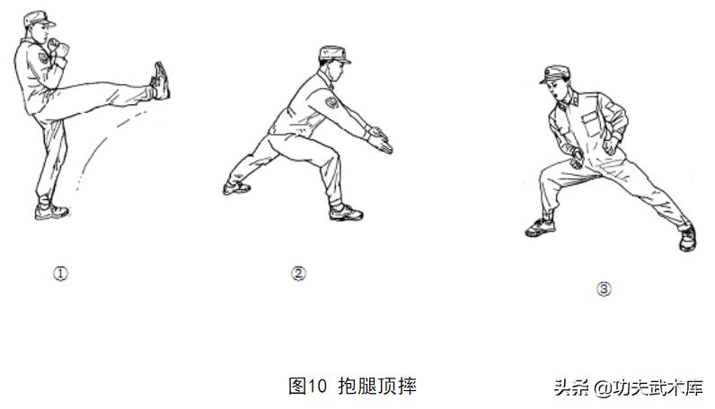 【动作要求】起脚前蹬猛,抱腿顶摔协调一致。