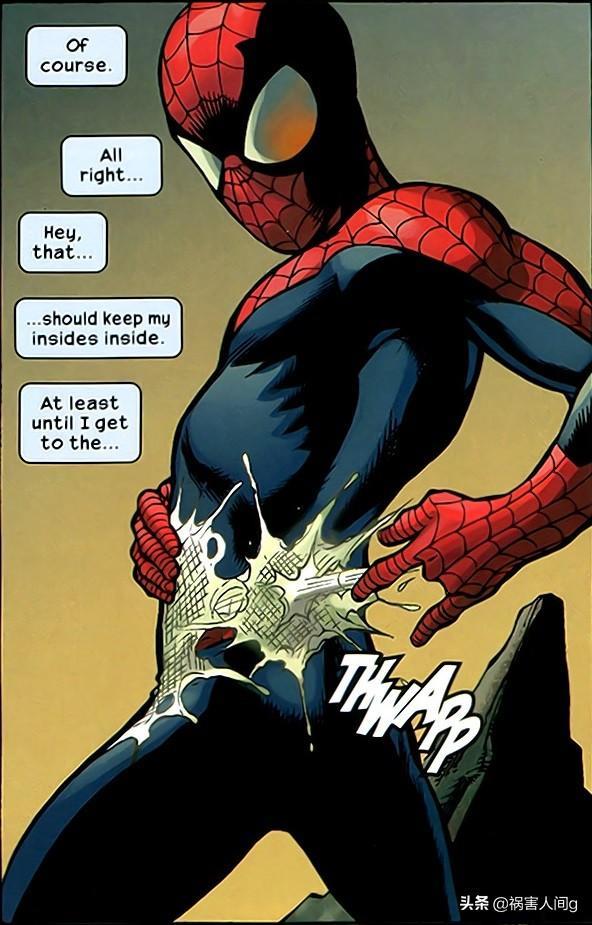 蜘蛛侠寻找逃狱六人组时,无意中发现惩罚者正在用狙击枪瞄准美国队长,于是他冲了出去,推倒了美国队长,自己被一枪打中。