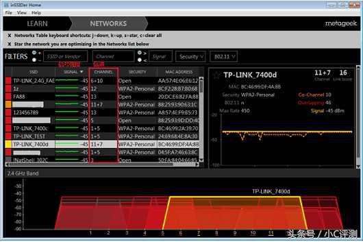 部分无线路由器的WDS功能不显示周围其他无线信号的信道,可以借助第三方软件,例如inssider软件。电脑下载安装inssider软件,电脑必须安装无线网卡,在软件中可以扫描周围环境中无线信号的信道以及信号强度,如下图: