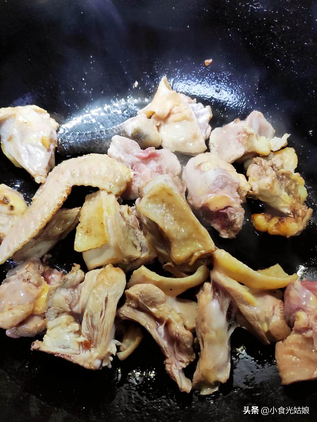 把洗干净的鸡肉倒入炒锅内,翻炒一下,煸出鸡油,这样翻炒好后的鸡肉炖汤更香。