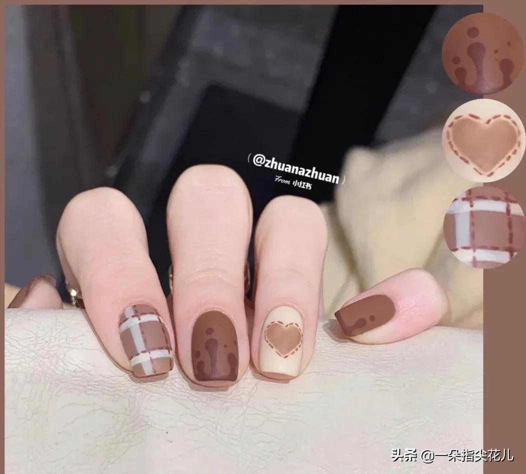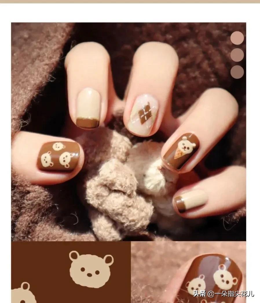 第一款:冬季棕色色系,配上可爱的小熊彩绘和格纹图案,很配毛衣哦。