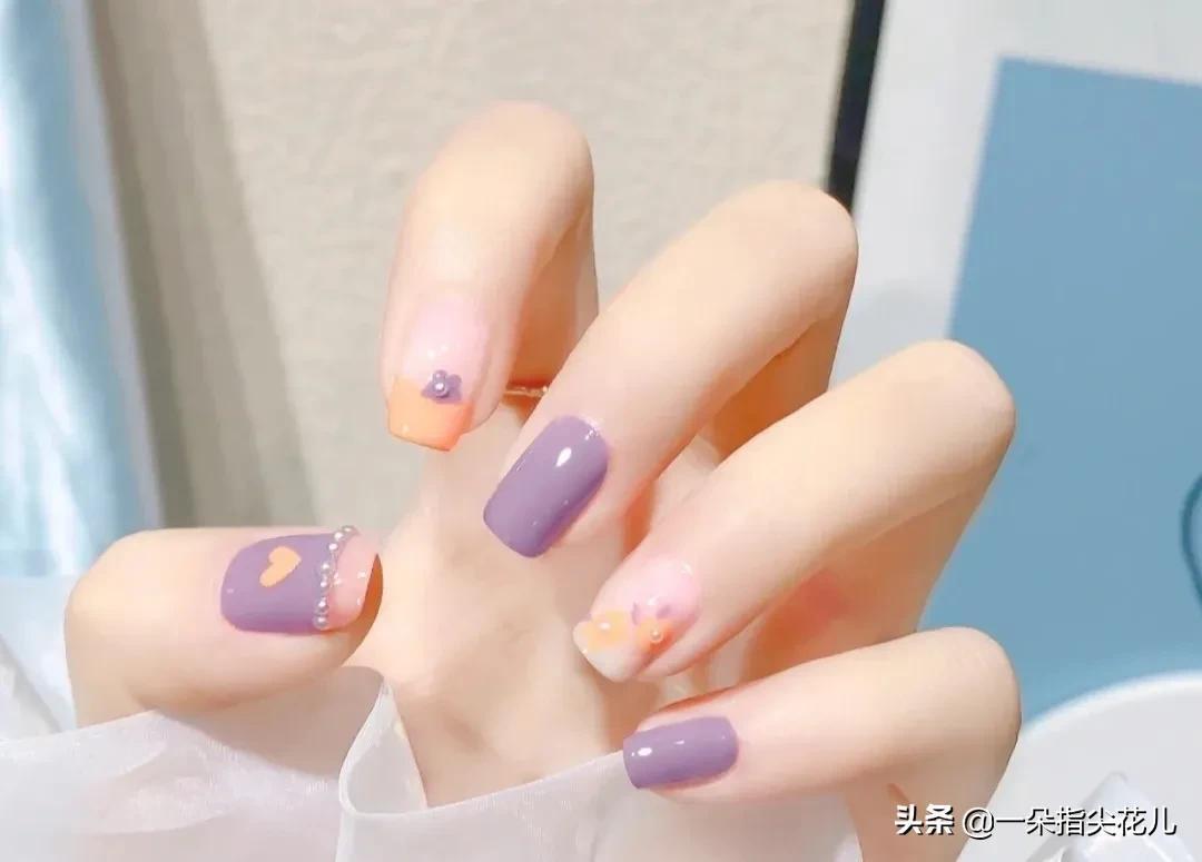 第五款:撞色款式,紫色撞黄色,简易五瓣花和彩绘爱心搭配立体小珍珠。