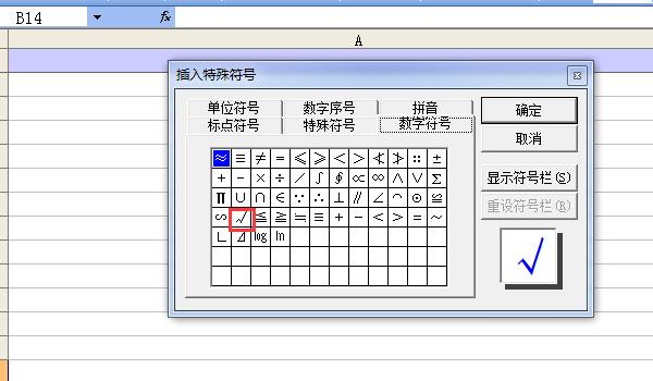 3、点击符号以后出现符号窗口,在符号窗口下面找到符号√,选中符号√然后点击插入。
