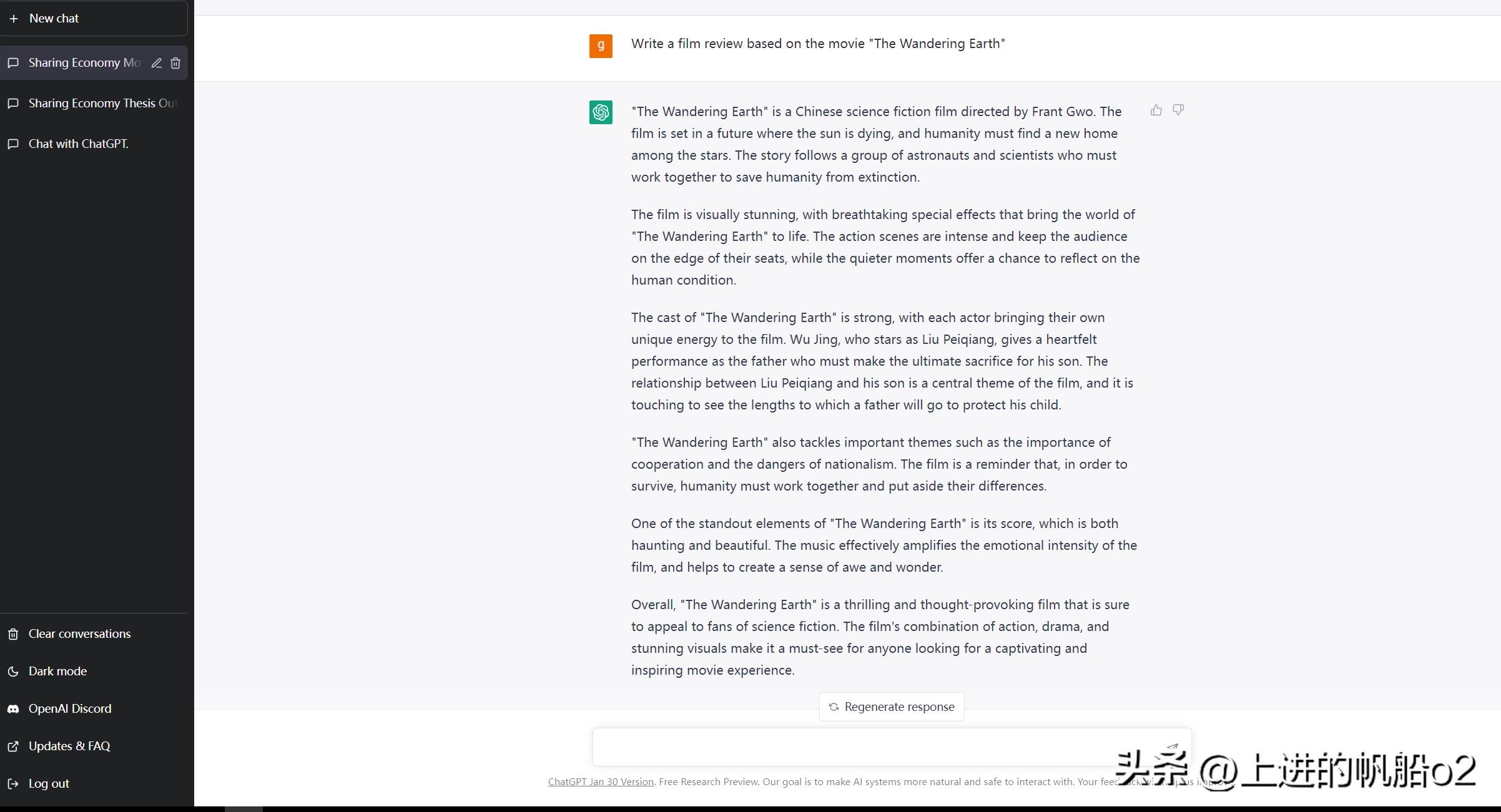 chatGPT写的《流浪地球》影评