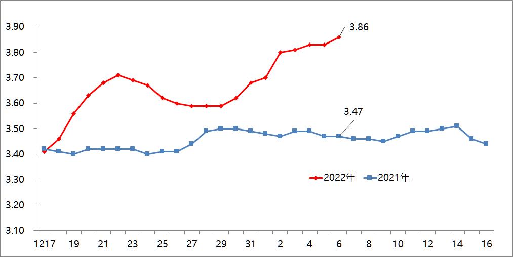 1月6日,新发地市场蔬菜加权平均价是3.86元/公斤,比上周同期(12月30日)的3.62元/公斤上涨6.63%;比去年同期的3.47元/公斤上涨11.24%。周环比明显上涨;年同比明显上涨。上周末,价格同比上涨3.43%,本周末同比涨幅明显放大。